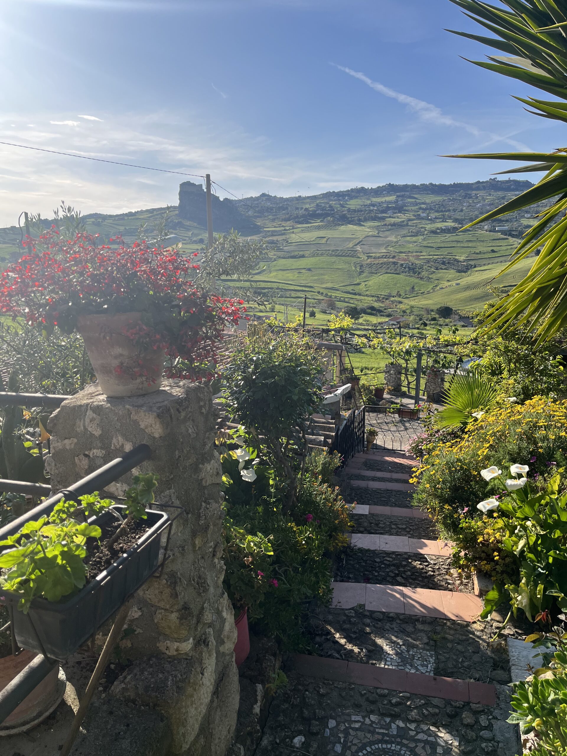 We did finally make it into town and got into our new accommodations. I recovered significanly once I got out of the car and saw the place. I even helped Chris walk the two local celebrities, the Brooks’ Newfoundlands Pippa and Arlo, though the narrow, winding cobblestone alleys of their neighborhood in the heart of Mussomeli’s historic s old district. Then I fell asleep pretty much as soon as I lay down in bed because it had been such a long day. Any lingering feeling of carsickness melted away overnight and was completel obliterated when I got up the next morning to see…